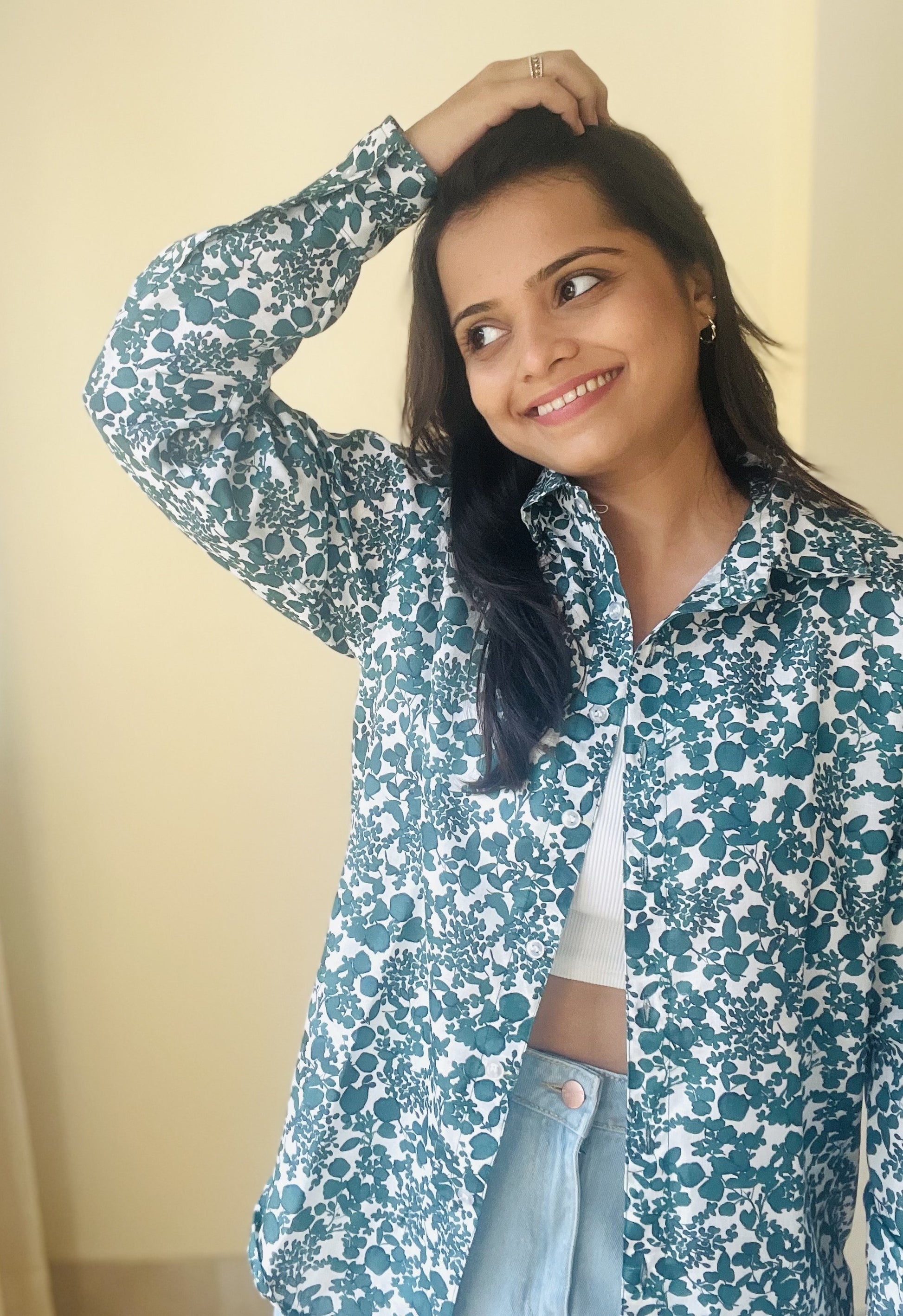 A breezy cotton shirt with refreshing green floral prints, perfect for a casual day out. Lightweight, versatile, and effortlessly stylish — pair it with denim or layer it for an easy everyday look.